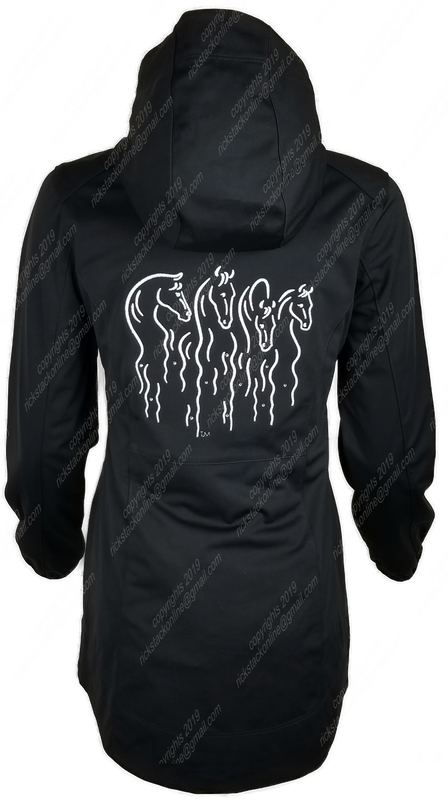 This item is a long black, soft shell jacket with stitching in white.