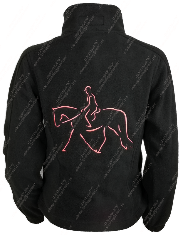 This image depicts a english horse in motion. The image is included on the front and back of the jacket. This is a ladies fit jacket. This item does not have rhinestones.
