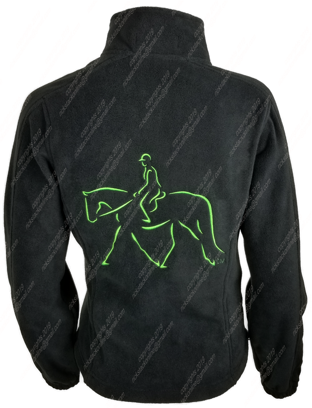 This image depicts a english horse in motion. The image is included on the front and back of the jacket. This is a ladies fit jacket. This item does not have rhinestones.