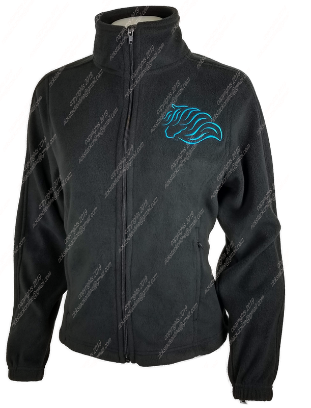 This elegant horse will catch others attention with a flowing mane and tail. The image on the front is of a horse looking to the side and the back image is of a side profile of a horse. This is a ladies fit jacket. This item does not have rhinestones.