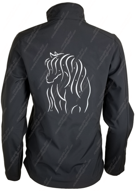 This elegant horse will catch others attention with a flowing mane and tail. There is a sprinkling of rhinestones to add a touch of class. The image on the front is of a horse looking to the side and the back image is of a side profile of a horse. This is a ladies fit jacket.