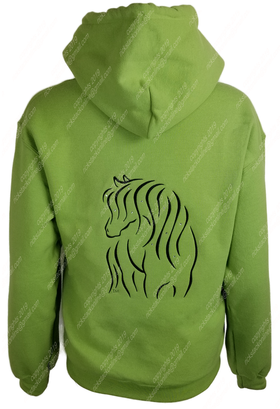 This item is a lime green hooded sweatshirt with stitching in black. This item includes rhinestones with the image on front and back.