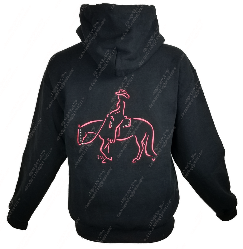 Show the world that you like to ride western. Added to the image are rhinestones on the bridle of the horse and saddle pad for a little flash. The image is included on the front and back of the hoodie.