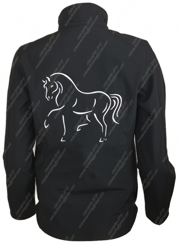 This prancing horse image displays proud movement and is located on the back of the article. The front image is of a horse head with a rhinestone headstall. This is a ladies fit jacket.