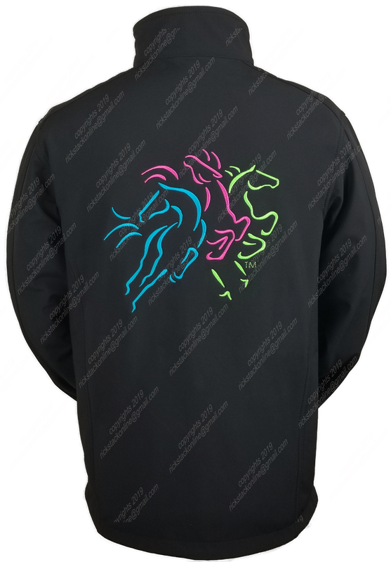 Three galloping horses make this image action packed. The three color combination makes this image vibrant. The front image depicts three horse heads with the back displaying full bodies on the jacket. This is a ladies fit jacket.