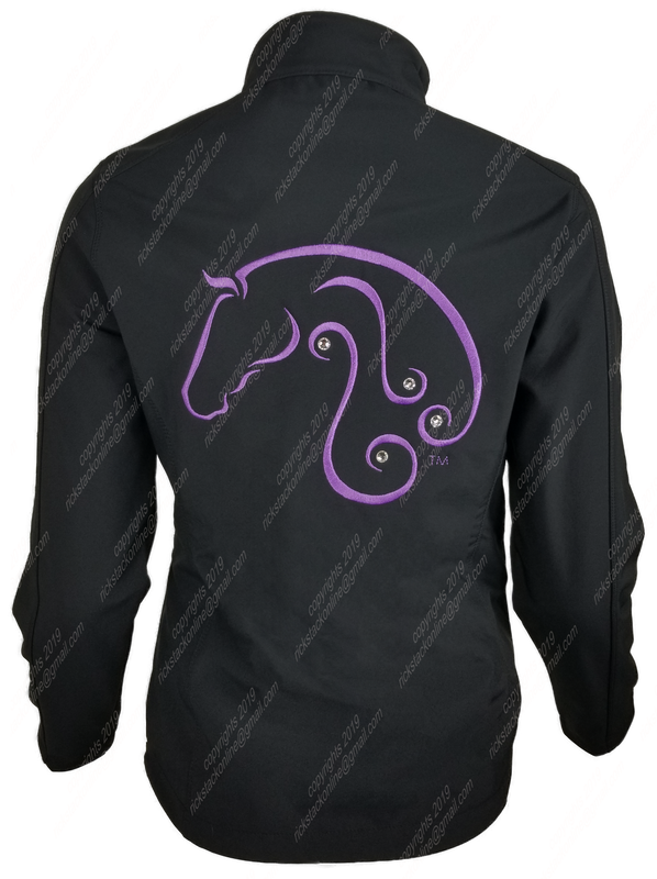 This is a beautiful horse head that you will get many compliments. There are rhinestones accenting the curves of the horse head. The image is included on the front and back of the jacket. This is a ladies fit jacket.