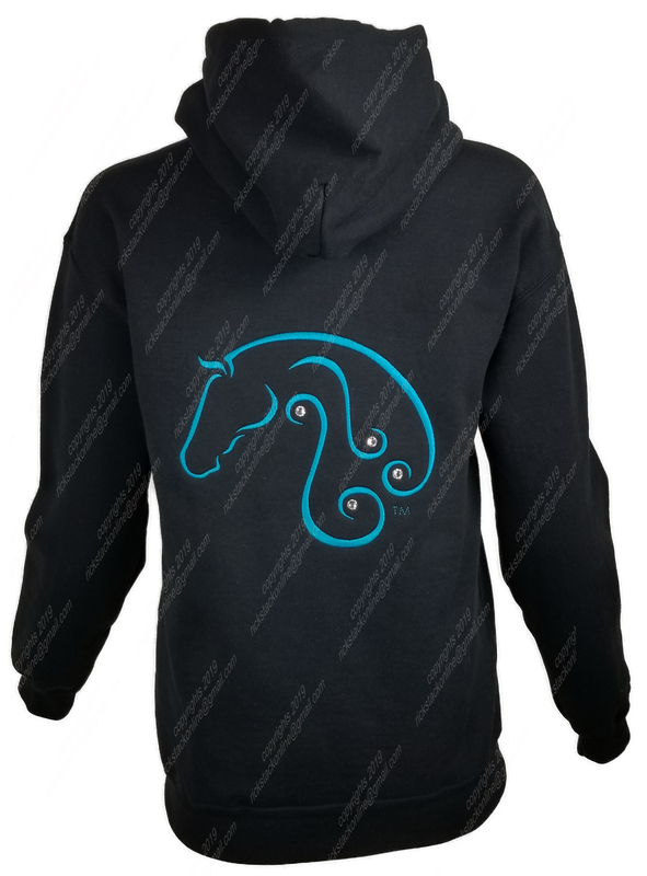 This is a beautiful horse head that you will get many compliments. There are rhinestones accenting the curves of the horse head. The image is included on the front and back of the hoodie.